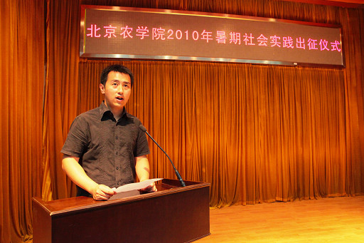 7月14日下午2点,我校2010年暑期社会实践出征仪式在图书馆报告厅举行。校党委副书记高东、团委书记杨宝东、各学院主管学生工作副书记、北京市重点团队指导教师、团总支书记等出席大会。100余支实践团队的领队参加了出征仪式。