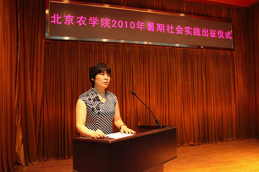 党委副书记高东为2010年暑期社会实践团队代表授旗并发表讲话。她指出,我校学生社会实践近年来取得了良好的成绩,连续七年受到市级表彰。特别是在服务首都基层农村发展方面,做出了农学院学生的贡献。她说,作为农学院的学生,一定要深入到农村,了解农村,为首都农村发展做贡献;一定要珍惜在校的每个假期,多参与实践活动,在实践中了解社会,提升本领,做出贡献。最后,高书记要求同学们在活动中一定要注意人身安全、交通安全、食品安全,平安顺利地完成实践任务。