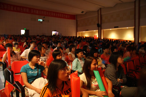 还未到7点钟,同学们已陆续进入礼堂,一同等待为这个激动的时刻加油喝彩!当大屏幕上出现鸟巢的外景时,同学们欢呼雀跃,虽然没能在鸟巢现场观看,但兴奋激动的心情毫不逊色于身临其境的感受。同学们一阵阵敲击手中的充气棒,全场的气氛随着开幕式的分秒临近而逐渐升温。