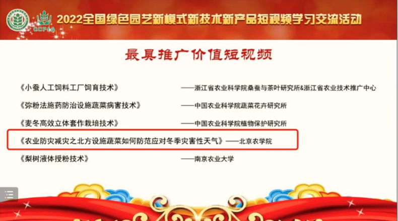 2022年11月30日,由北京农学院国家大学科技园统筹策划的短视频《农业防灾减灾之北方设施蔬菜如何防范应对冬季灾害性天气》,荣获2022全国绿色园艺新模式新技术新产品短视频学习交流活动“最具推广价值短视频”奖项。