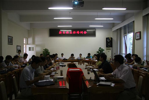 ,新生班主任培训会在教学楼B座209召开,党委副书记王晓霞出席会议,学生处韩宝平处长主持培训,2008年新生的班主任参加了会议。