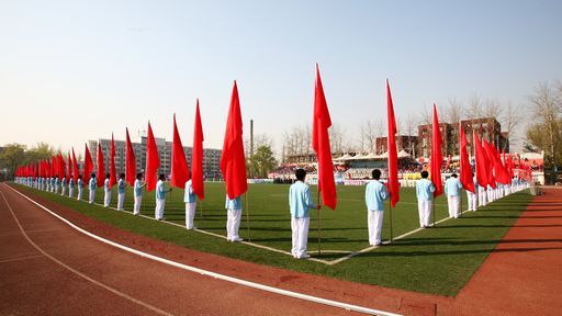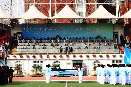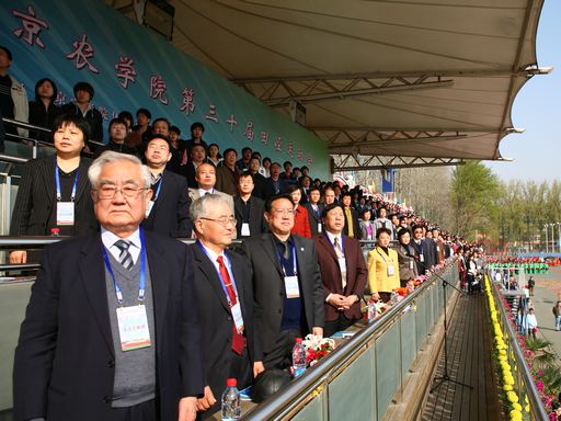 主持人“全体肃立”的声音未落,看台上的观众们已经全部齐齐地站了起来,身姿笔直,面向国旗。雄浑的《义勇军进行曲》响彻北农,女子国旗班的成员们升起了五星红旗。随后,北京农学院校旗与运动会会旗在嘹亮的《绿色的希望》的歌声中缓缓升起。春风拂过,国旗、校旗、会旗与环绕操场的队旗、彩旗一起飞扬,校园里充满了春天的气息。