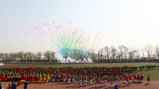 参与开幕式文艺表演的同学们纷纷挥舞着手中的道具,在《爱我中华》的歌声中像潮水一般涌向主席台。“砰砰砰……”连珠炮的烟火声吸引了所有人的目光,礼花升空,五彩缤纷,绚烂夺目,在蓝天白云的映衬下,美不胜收。