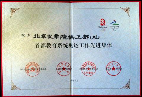 近日,校保卫部(处)被中共北京市委教育工委、北京市教委、共青团北京市委、北京市学联授予“首都教育系统奥运工作先进集体”荣誉称号。