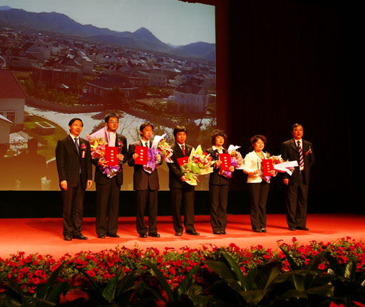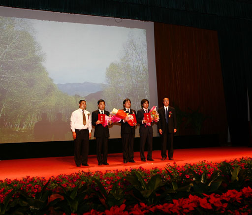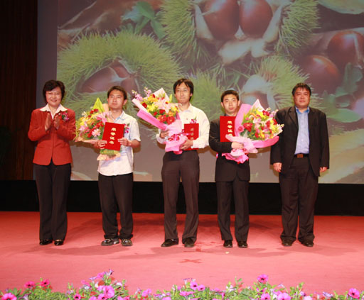 延庆县委组织部副部长、人事局局长李景荣、千家店镇副镇长尤宝军为千家店镇村官王璐、姜浩、刘建学颁奖