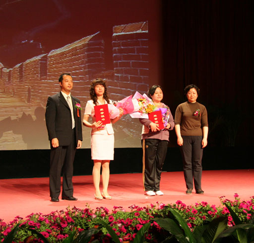 北京市教委副主任郭广生、延庆镇党委组织委员李英铁为延庆镇村官李娜、王雪、邱有东、张璐怿、刘建涛颁奖