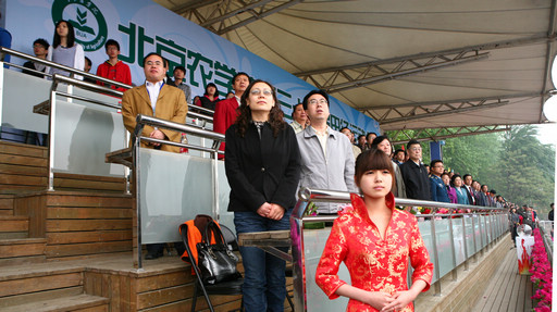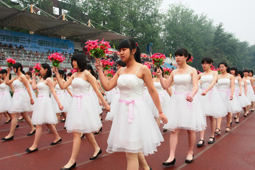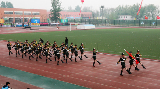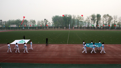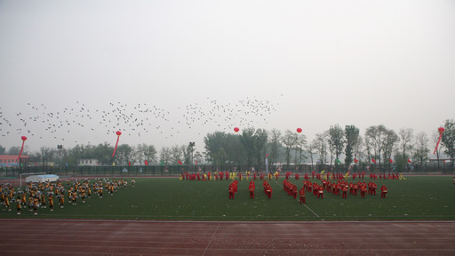 伴随着校长王有年宣布运动会开幕,寓意着“和谐”的2000只和平鸽从操场上空穿过,顿时间,锣鼓喧天,田径场上一片欢腾。