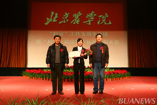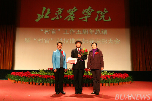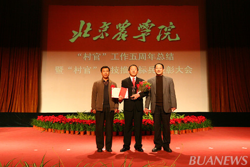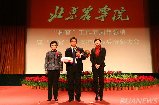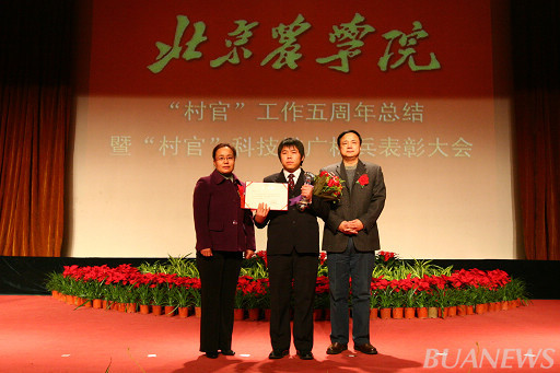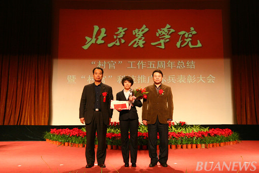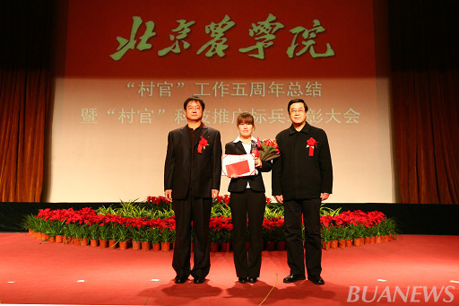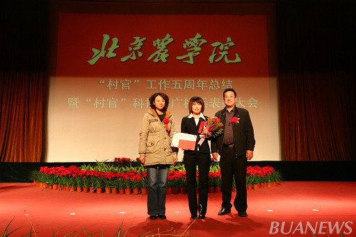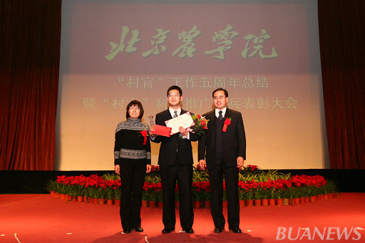 顺义区人力社保局村官办主任李景贵、我校学生处处长韩宝平为王爽颁奖