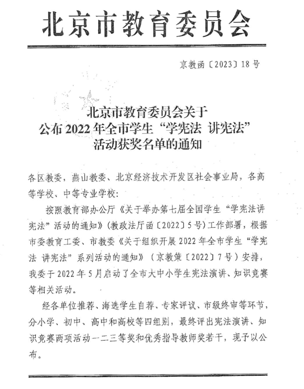 据悉,市委教育工委、市教委于2022年上半年启动了全市大中小学生宪法演讲、知识竞赛等相关活动。经各单位推荐、海选学生自荐、专家评议、市级终审等环节,分小学、初中、高中和高校等四组别,最终评出宪法演讲、知识竞赛两项活动一二三等奖和优秀指导教师奖若干。