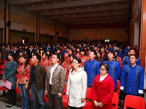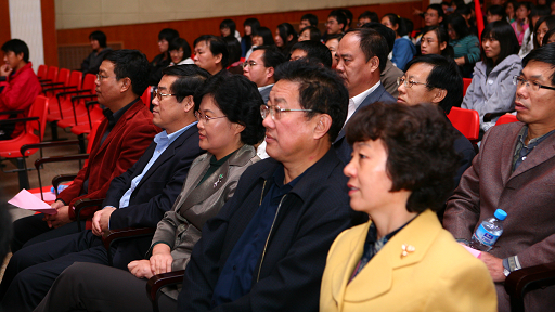 礼堂内彩旗飘扬,歌声飞扬。我校党委书记王慧敏,校长王有年,党委副书记高东、高喜军,副校长杜晓林、郑一淳、姚允聪,纪委书记朱生利,以及国庆领导小组成员、各院(系)的直接参与国庆60周年群众游行工作的领导、老师及其全体游行人员参加了此次表彰大会。