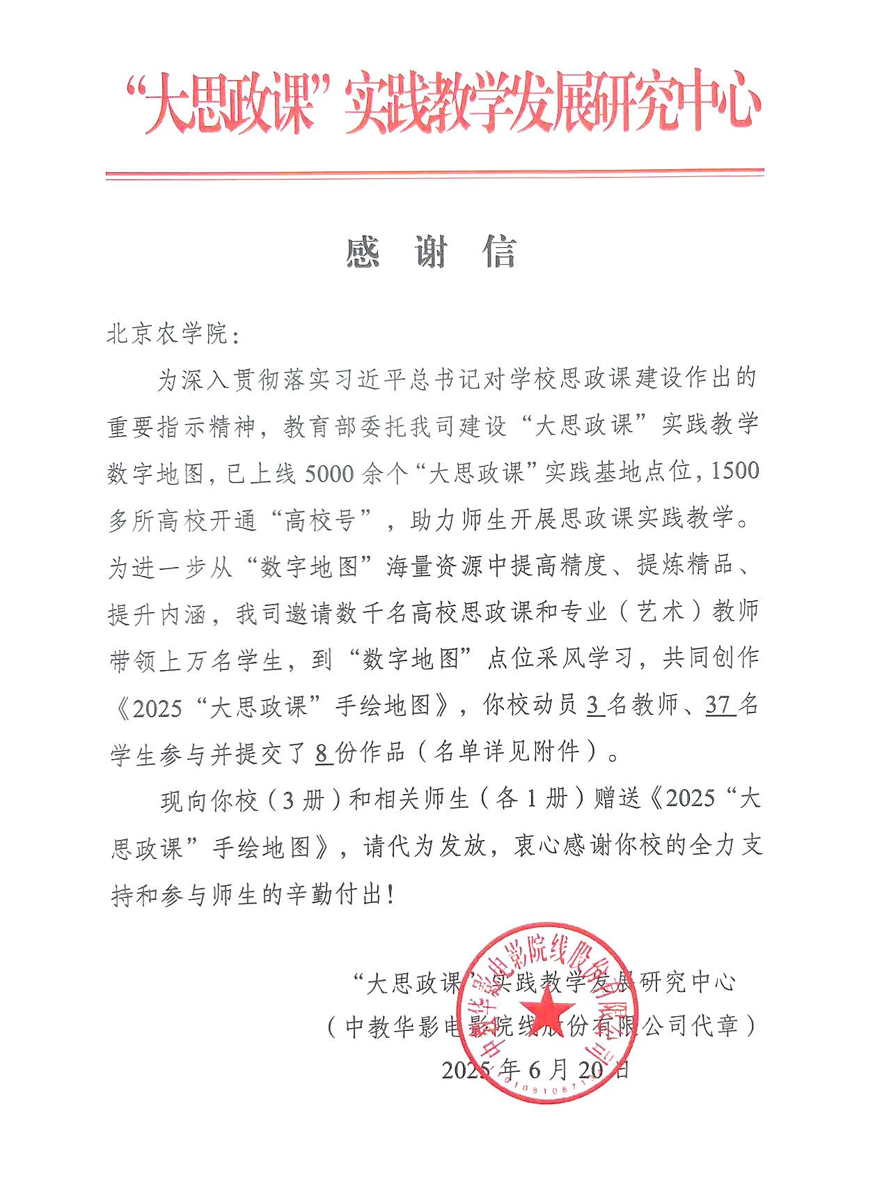 学校深入贯彻落实习近平总书记关于思政课建设的重要论述和重要指示精神,组织思政课教师带领学生积极参与《2025“大思政课” 手绘地图》创作,并提交了8份作品,“大思政课” 实践教学发展研究中心来信向我校师生表示感谢。