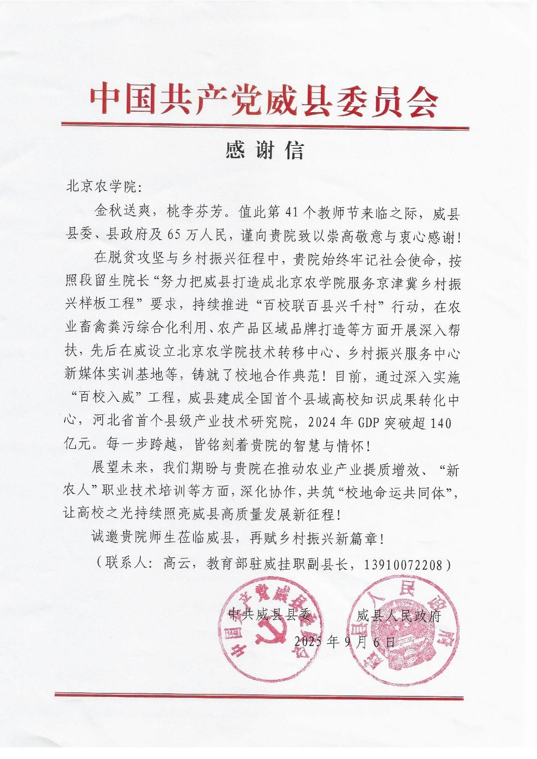 学校始终坚持以强农兴农为使命,积极参与“百校联百县兴千村”行动,以“打造北京农学院服务京津冀乡村振兴样板工程”为目标,在威县农业畜禽污染综合治理利用、农产品区域品牌打造等方面开展深入帮扶,先后在威县设立北京农学院技术转移中心、乡村振兴服务中心新媒体实训基地等,助力威县建成全国首个县域高校知识成果转化中心。威县政府来信感谢我校在校地合作中的突出贡献,希望双方在推动农业产业提质增效等方面进一步深化协作。