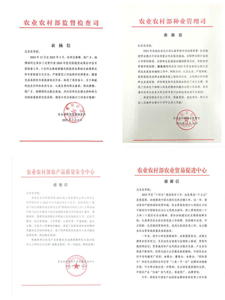 学校长期支持和参与巩固拓展脱贫成果工作,我校唐衡教授、徐广才教授、杨博琼副教授圆满完成对相关省份巩固脱贫成果后评估核查工作;刘芳教授、康海琪等在2025年度畜禽种业统计监测及发展报告编制工作中,高质高效完成种业数据采集上报相关任务;苟天来教授、唐衡、郭晓雁等积极参与乡村振兴领域整治形式主义为基层减负专题调研,高质量完成报告起草任务;赵海燕教授团队积极参与中国农产品国家品牌培育研究,为相关工作的顺利推进提供了坚实保障;郑伊帆同学在实习期间参与《北京市蔬菜个性化追溯服务模式研究》报告撰写、专项课题调研等工作。农业农村部监督检查司、种业管理司、农业贸易促进中心、农产品质量安全中心近日相继向学校发来表扬信,对学校师生作出的贡献给予充分肯定。