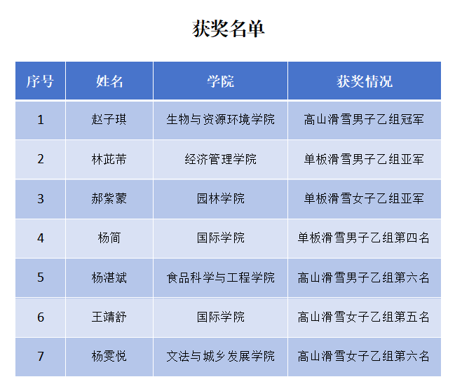 1月2日至4日,首都高等学校第18届滑雪比赛在北京延庆国家高山滑雪中心举行,来自清华大学、北京大学、北京体育大学等49所高校的53支代表队参赛。参赛学校和报名运动员人数创历史新高。经激烈角逐,我校生物与资源环境学院赵子琪同学获得高山滑雪男子乙组冠军,经济管理学院林茈芾同学获得单板滑雪男子乙组亚军,园林学院郝紫蒙同学获得单板滑雪女子乙组亚军,学校获得乙组团体总分第二名。