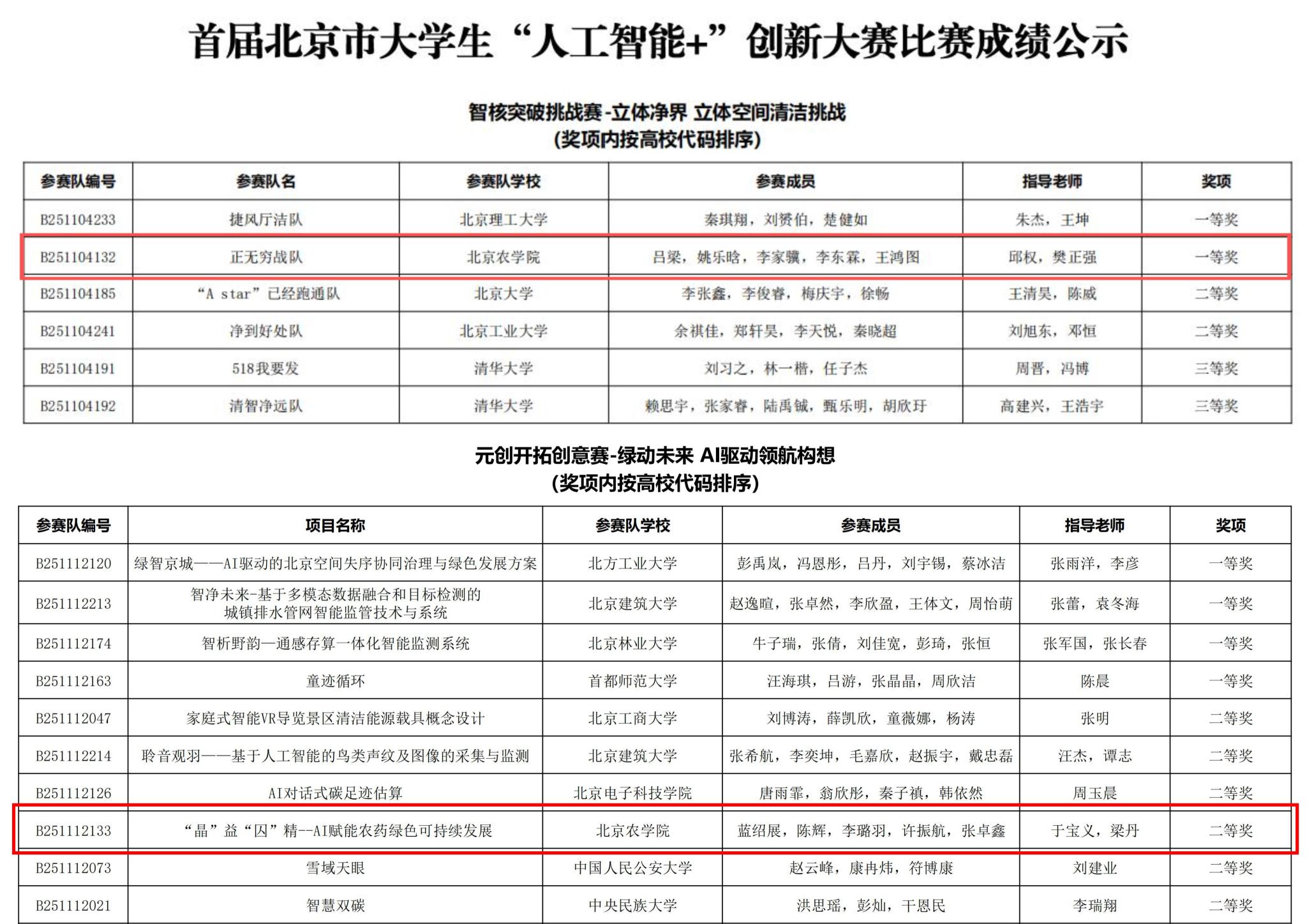 近日,由北京市教委主办的首届北京市大学生“人工智能+”创新大赛在北京工业大学落幕。我校智能科学与工程学院吕梁、姚乐晗、李家骥、李东霖、王鸿图5名同学组成的“正无穷战队”,在邱权、樊正强两位老师指导下,斩获“智核突破挑战赛”一等奖。生物与资源环境学院蓝绍展、陈辉、李璐羽、许振航、张卓鑫5名同学在于宝义、梁丹两位老师的指导下,凭借“‘晶’益‘囚’精--AI赋能农药绿色可持续发展”项目荣获“元创开拓创意赛”二等奖。