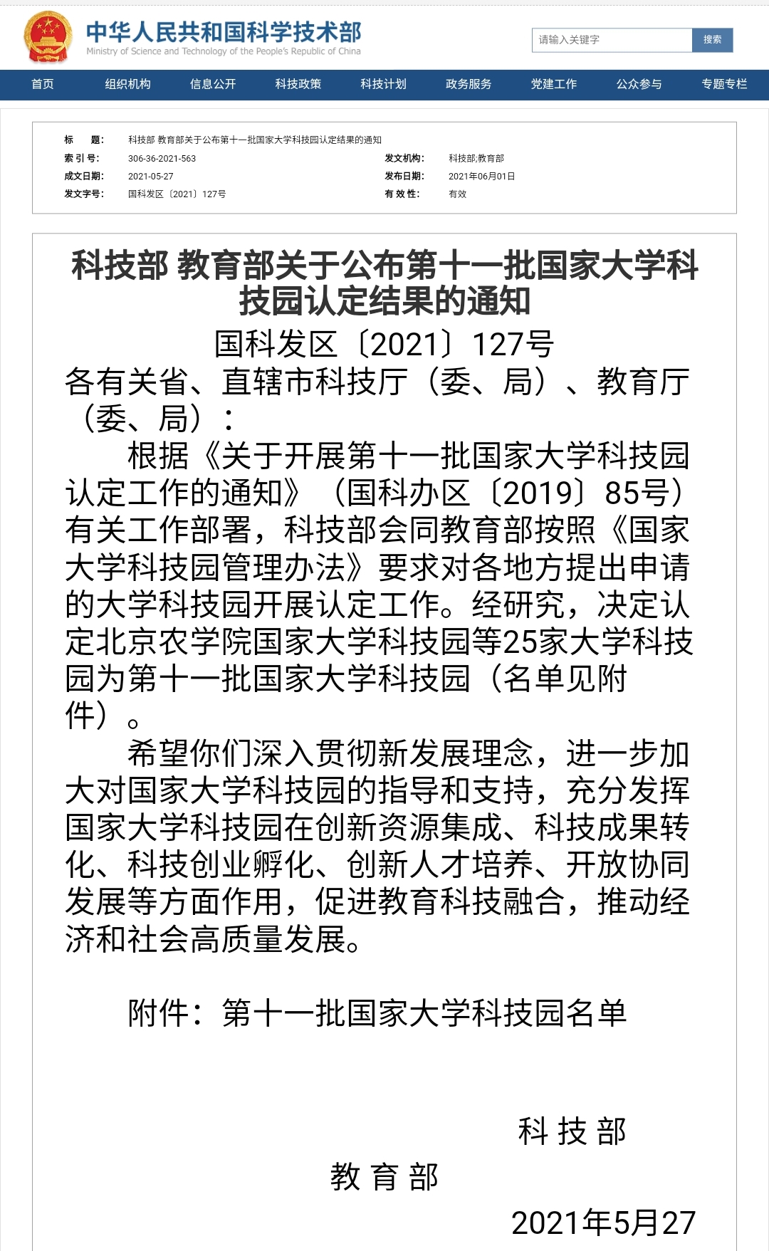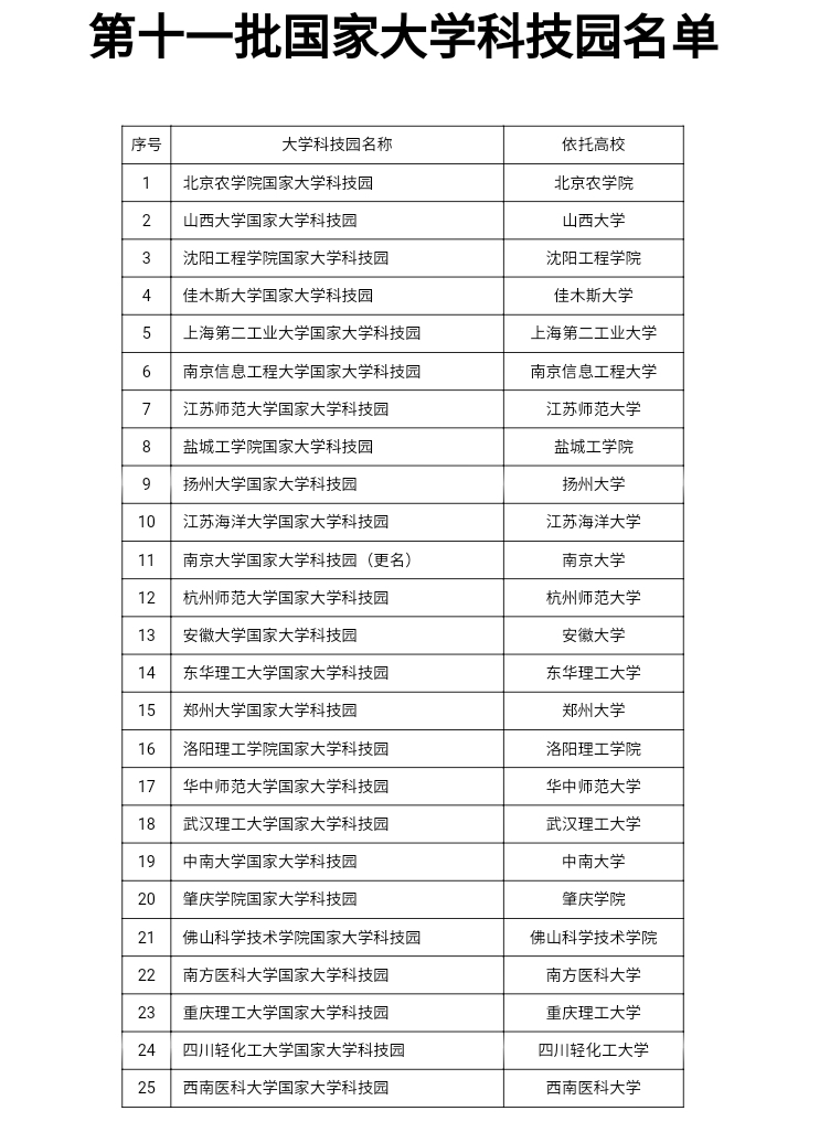 5月27日,科技部、教育部联合发布《科技部、教育部关于公布第十一批国家大学科技园认定结果的通知》(国科发区〔2021〕127号),我校大学科技园被认定为国家大学科技园。