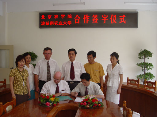 7月7日波兰POZNAN农业大学副校长与种子科学系主任到我院来访,我院院长王有年、植物科学技术系领导和有关专业教师及外事办科研处参加了座谈交流。双方就学生交流、研究生教育、青年教师攻读博士和科研合作达成了合作意向。王伟副院长代表北京农学院和POZNAN农业大学签定了合作备忘录。