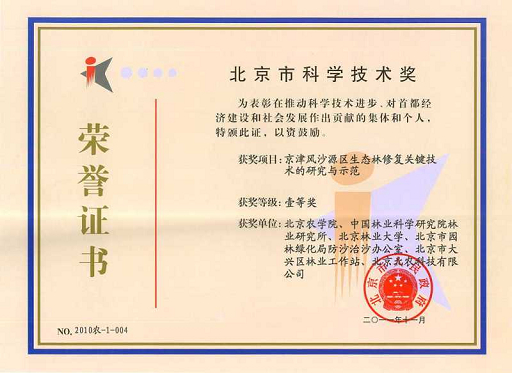 日前,北京市科学技术奖励大会暨2012年北京市科技工作会议在北京国际饭店会议中心召开,中共中央政治局委员、北京市委书记刘淇,市长郭金龙等领导出席大会并为获奖代表颁奖。我校作为第一完成单位的“京津风沙源区生态林修复关键技术的研究与示范”项目荣获2010年度北京市科学技术奖一等奖,合作完成单位有:中国林业科学研究院林业研究所、北京林业大学、北京市园林绿化局防沙治沙办公室、北京市大兴区林业工作站、北京北农科技有限公司等。项目主持人王有年教授代表获奖项目组领奖,项目组成员还有我校师光禄、谷继成、任建军、王建文、姚山、乔富强等。