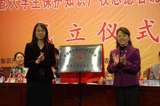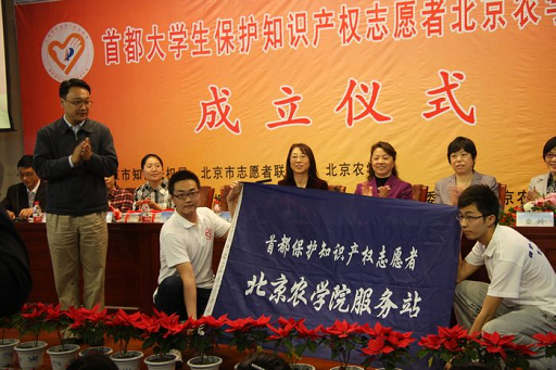 仪式上,王淑贤与高东一起为大学生保护知识产权志愿者北农服务站揭牌。张楠向我校志愿者代表授旗,与会各位领导还向北农服务站志愿者赠送了有关知识产权保护的书籍。