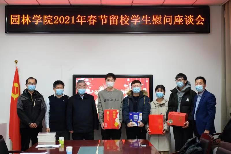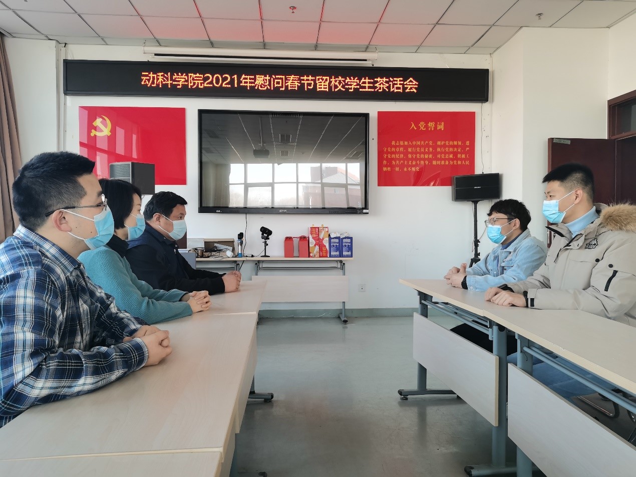 2月9日, 动科学院院长郭勇、副院长张思明,研究生辅导员尹伊与留校学生开展座谈。叮嘱同学们留校期间遵守校规校纪,注意实验室安全,并为留校学生发放了新春大礼包。