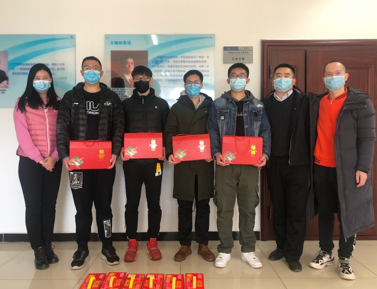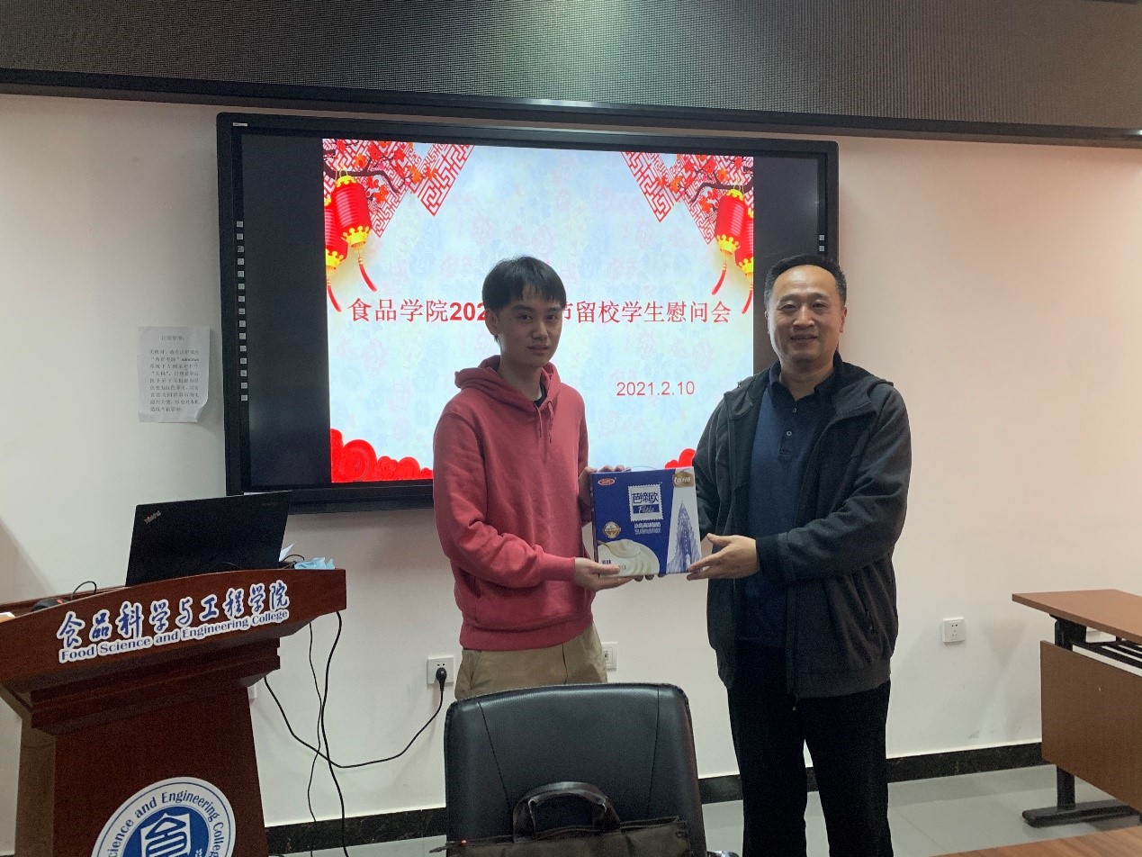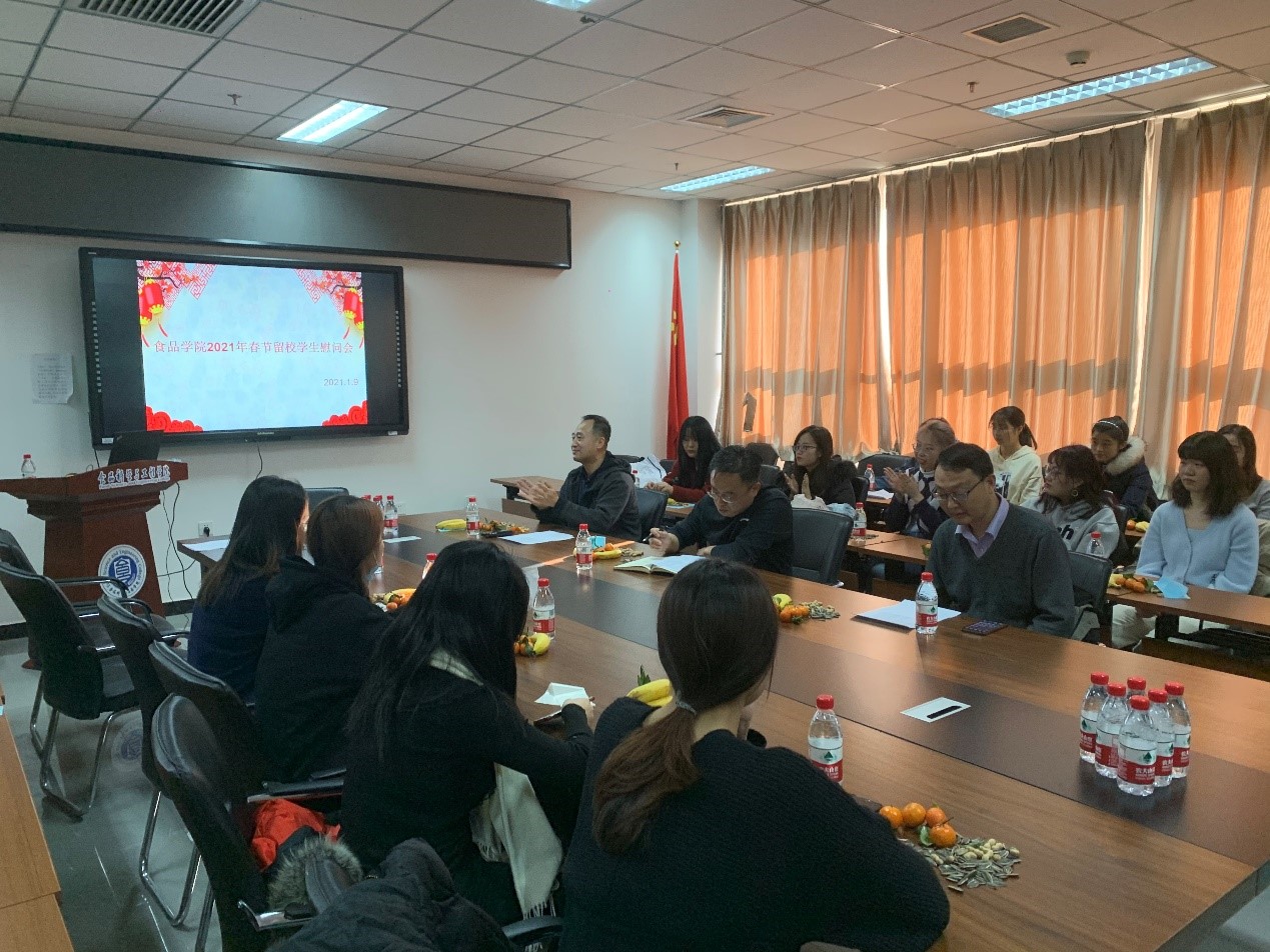 食品学院召开留校学生慰问会,了解学生寒假期间留校学习、生活情况并为学生发放慰问品。