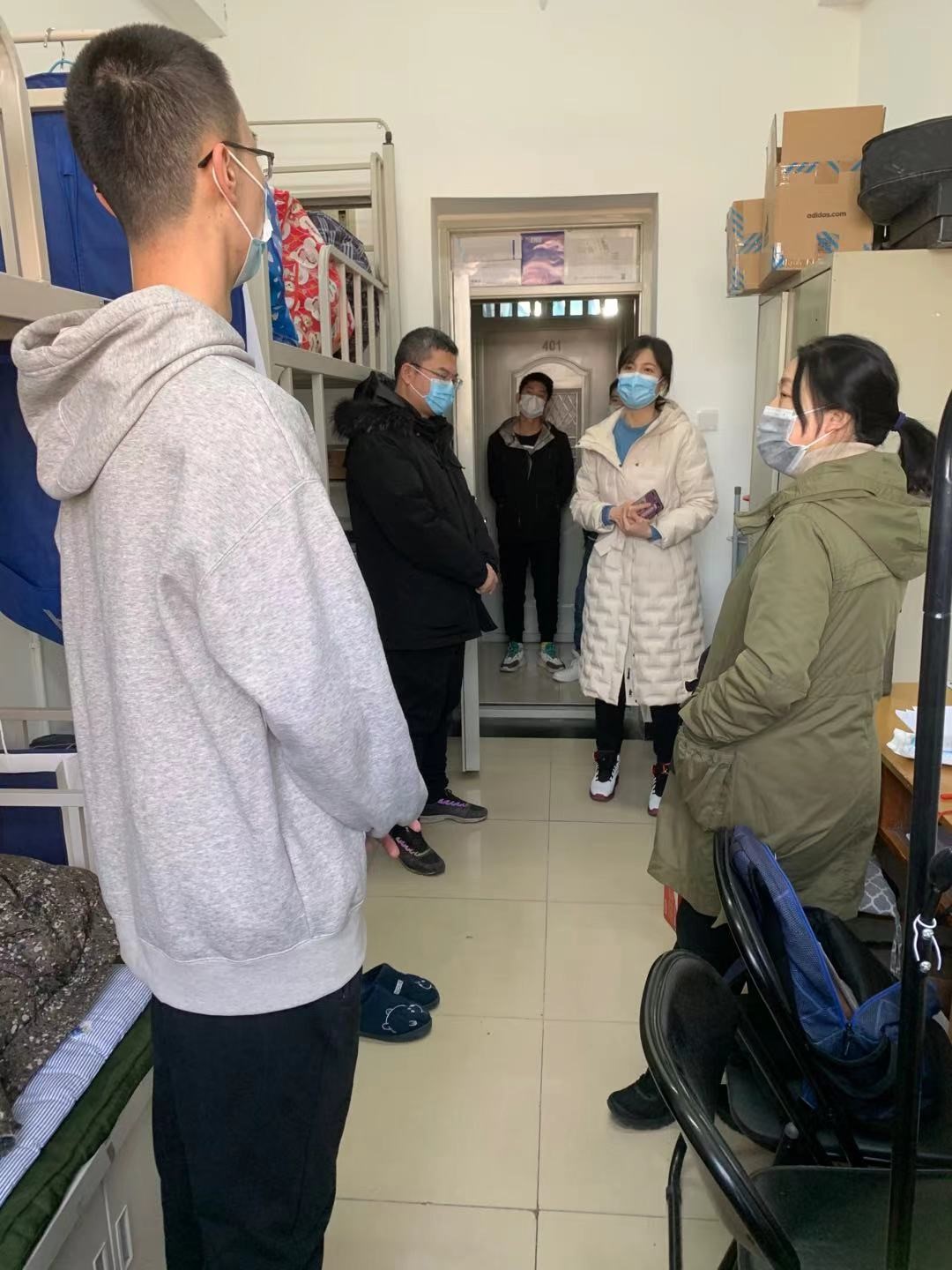 2月10日,文发学院院长韩芳,副院长李云乐、夏龙,辅导员李向楠到学生宿舍慰问留宿研究生。