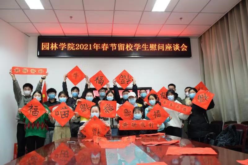 2月9日,园林学院领导班子成员与全体留校学生座谈并向留校学生发放慰问礼包、赠送书籍《文献中的百年党史》。学院老师还与在校生共同写春联、写福字,开展了别开生面的文娱活动。同学们纷纷表示,感谢学校、老师的关心和关怀,在校期间会严格遵守学校规定,学习上不放松,生活上不马虎,疫情防控不大意。