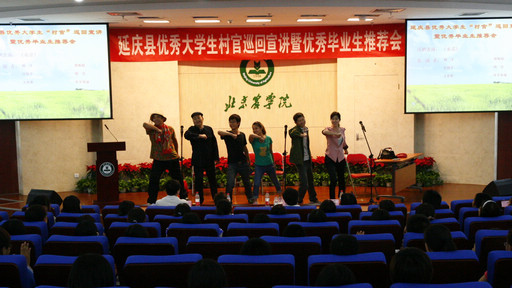 5月10日下午,延庆县优秀大学生“村官”巡回演讲暨优秀毕业生推荐会在我校图书馆报告厅举行。校党委副书记高东,延庆县人力资源和社会保障局副局长梁利锋,延庆县村官办主任杨娟出席宣讲会,延庆县优秀村官代表以及部分大学生村官艺术团成员,我校各学院200余名学生参加宣讲会。宣讲会由学生处处长韩宝平主持。