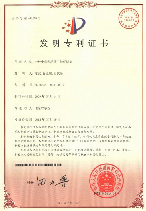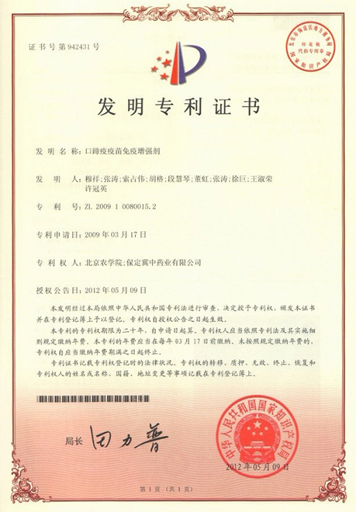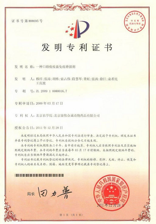 近日,我校动物科学技术学院兽医学(中医药)北京市重点实验室穆祥教授团队申请的专利“口蹄疫疫苗免疫增强剂(专利号:ZL200910080015.2)”、“一种口蹄疫疫苗免疫增强剂(专利号:ZL200910080016.7)”和陈武教授团队申请的专利“一种中草药动物生长促进剂(专利号:ZL200910084208.5)”获批国家发明专利。
