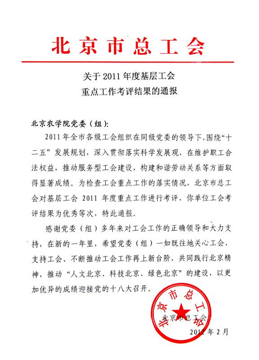 近日,我校工会在全市74家高校、18个区县教育工会和16家医学院校附属医院等单位中脱颖而出,获北京市总工会“重点工作考评优秀单位”称号。
