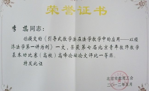 近日,第七届北京青年教师教学基本功比赛(高校)高峰论坛论文评比结果揭晓,我校人文社会科学学院李蕊老师撰写的教改论文《引导式教学法在法学教学中的应用——以经济法学第一讲为例》获得一等奖。