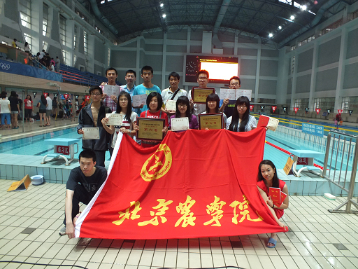 日前,我校游泳队14名同学在教练吴宝利带领下,参加了由北京市教委、北京市体育局主办,清华大学承办的2012年首都高校游泳冠军赛,20多所高校200多名运动员参加了此次比赛。我校游泳队在比赛中奋勇拼搏,获得了男子自由泳冠军、女子4*自由泳接力第三名、男子团体总分第六名、女子团体总分第七名、男女团体总分第六名的优异成绩。