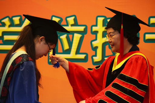校长、校学位委员会主席王慧敏教授为硕士学位获得者一一挑理流苏,授予学位并颁发证书。