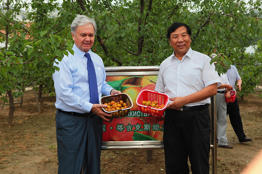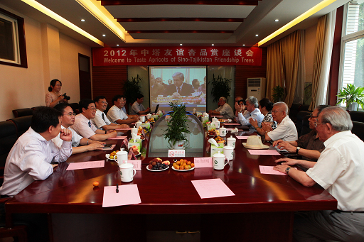 日前, 2012年中塔友谊杏品赏座谈会在我校举办。塔吉克斯坦特命全权驻华大使拉希德·阿利莫夫(H.E. Mr. Rashid Alimov, Ambassador Extraordinary and Plenipotentiary)及大使夫人拉希德·阿利莫夫夫人(Mrs. Zamira Asimova),国务院发展中心欧亚社会发展研究所研究员、中央民族大学教授胡振华,原中国驻土库曼斯坦大使殷松龄,原中国驻乌兹别克斯坦大使张志明,原中国驻塔吉克斯坦大使傅全章,中国社科院俄罗斯东欧中亚研究所副研究员赵会荣,人民网外文部副主任刘慧等中外嘉宾应邀参加了座谈会。我校党委书记郑文堂,副校长杜晓林,原校长王有年教授,果树专家刘志民教授、董清华教授,国际合作与交流处处长张志勇,植物科技学院院长潘金豹,人文学院教授胡勇等出席了座谈会。