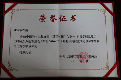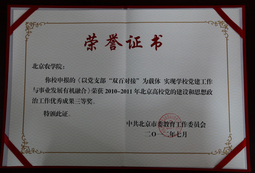 日前,北京高校党的建设和思想政治工作评选结果揭晓,我校申报的《以党支部“双百对接”为载体实现学校党建工作与事业发展有机融合》荣获2010—2011年北京高校党的建设和思想政治工作优秀成果三等奖。我校申报的《以党支部“双百对接”为载体实现学校党建工作与事业发展有机融合》荣获2010—2011年北京高校党的建设和思想政治工作创新成果奖。
