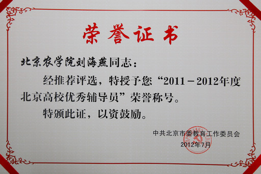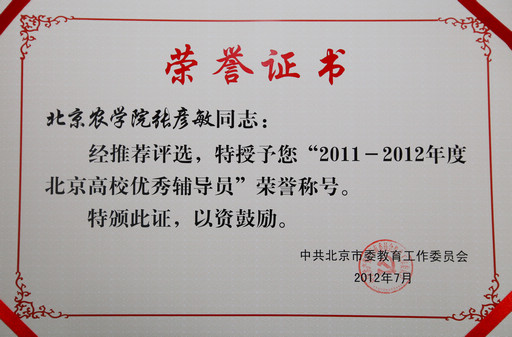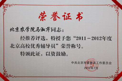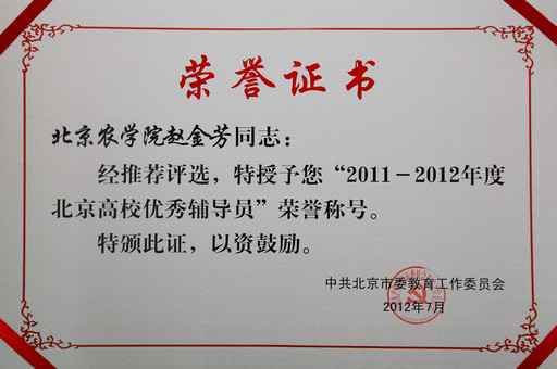 日前,市委教育工委公布了获“2011-2012年度北京高校优秀辅导员”称号的名单,我校赵金芳、张彦敏、马淑芹、刘海燕被授予“2011-2012年度北京高校优秀辅导员”称号。