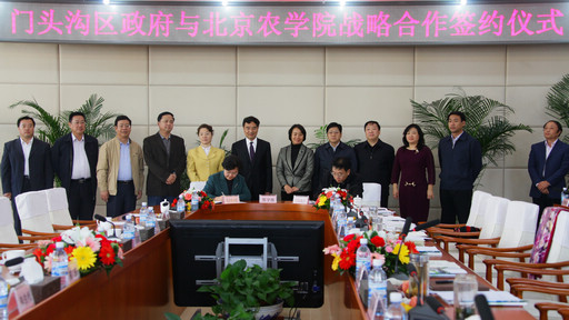 10月25日上午,北京农学院与门头沟区人民政府战略合作签约仪式在门头沟区政府会议楼举行,门头沟区区委书记韩子荣,区长王洪钟,区委副书记、区委政法委书记付兆庚,区委常委、副区长张永,区委常委、区委宣传部部长、区旅游委主任石军,区委常委、区委办公室主任彭利锋,北京农学院党委书记郑文堂,校长王慧敏,党委副书记高东,副校长郑一淳、姚允聪,纪委书记朱生利,校长助理范双喜出席签字仪式。签字仪式由门头沟区区委书记韩子荣主持。