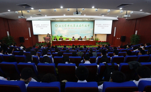 应北京农学院食品科学与工程学院的邀请,安徽农业大学中华茶文化研究所丁以寿教授在第五届食品节上为我院师生作报告。他通过大量的历史文献资料、诗词、图片展示了绚丽多彩的中国茶文化,他希望同学们以茶会友,学习推广茶文化,不断弘扬中华民族的优良传统。教务处副处长李奕松老师作为指导教师为食品科学与工程学院茶艺协会授旗,标志着茶艺协会正式成立。