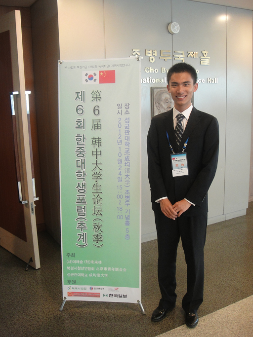 10月22日至27日,第十一届中韩大学生志愿者交流营(秋季)活动在韩国举行。以北京团市委副书记熊卓为团长,由北京团市委机关干部代表、相关专家、媒体记者和大学生骨干组成的共一百余人中方代表团赴韩开展广泛交流,首都大学生英才学校学生、我校经济管理学院2010级工商管理专业周牧同学作为中方代表参加活动。