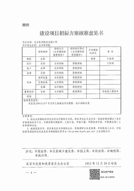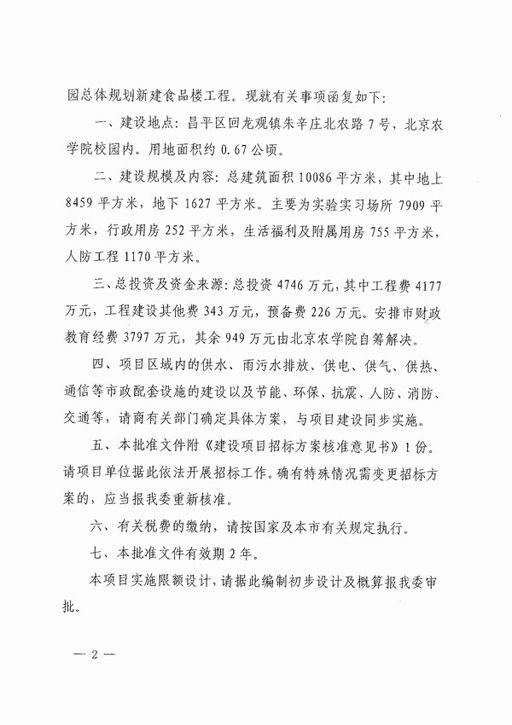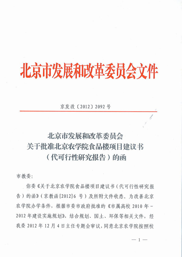 日前,我校食品楼项目建议书(代可行性研究报告)得到北京市发改委正式批准,项目总建筑面积10086平方米,批准投资估算4746万元(不含减免城市基础设施建设费100万元)。详见京发改【2012】2092号文件。另外,我校学生活动中心项目建议书(代可行性研究报告)目前也已经通过市发改委项目评估,项目建筑面积3985平方米,投资估算1900万元。