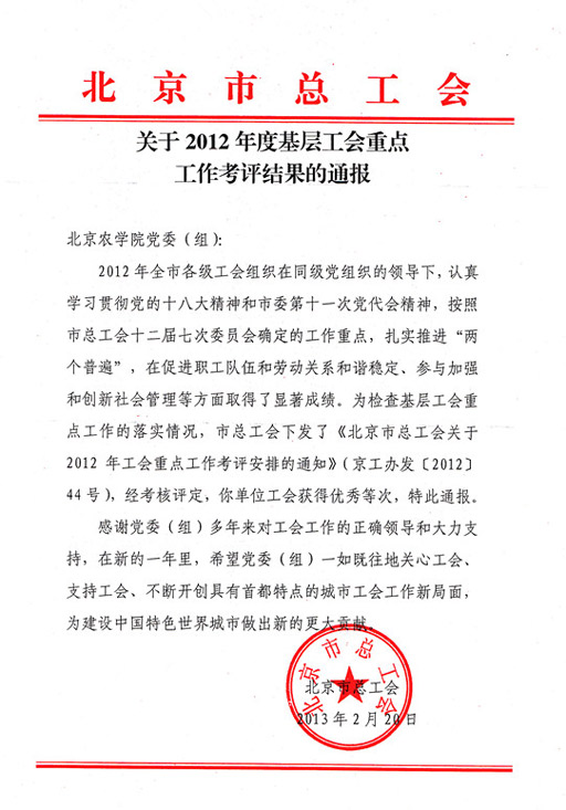 日前,我校工会荣获由北京市总工会授予的“2012年度基层工会重点工作考评优秀单位”光荣称号。