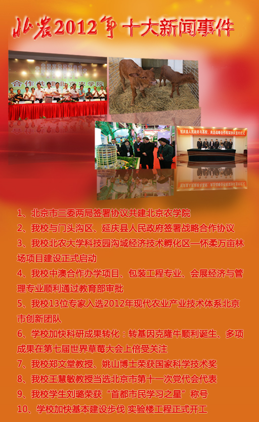 今天的新闻就是明天的历史。为了更好地记录学校发展进程中的重要节点,党委宣传部在全校范围内开展2012年十大新闻事件评选活动,经过广泛征求意见、师生评选、专家评审,北京农学院2012年十大新闻事件正式揭晓。 此次评选以新闻本身的重要性、受关注度等为标准,经广泛征求意见,从全年发表于校报和新闻网的近1000条新闻中筛选出37条候选新闻事件。经过在全校范围内发放选票、在北京农学院官方微博发起网络投票、专家评审等多个环节,最终评选出“北京农学院2012年十大新闻事件”。
