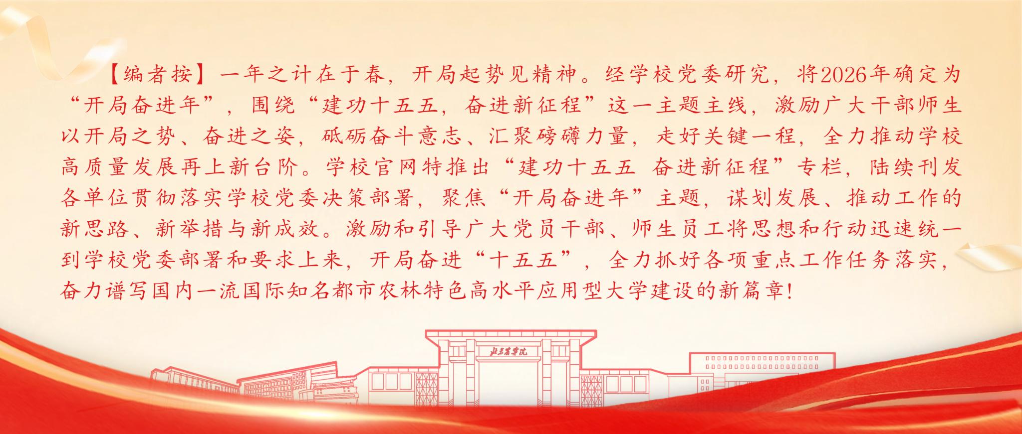 “开局关系全局,奋进决定未来。”杨宝东表示,学院全体师生将牢固树立“开局即决战、起步即冲刺”的奋进意识,以“时不我待、只争朝夕”的精神状态,真抓实干、创先争优,全力完成年度各项目标任务,以实干实绩推动实现“十五五”良好开局,为北京农学院建校70周年献礼!