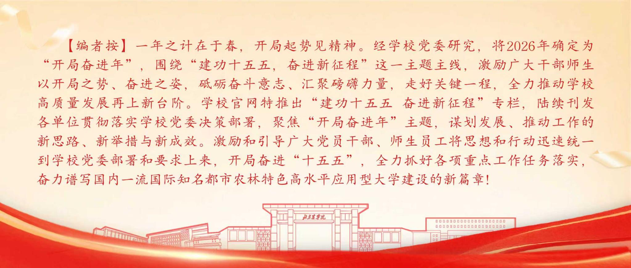 “十五五”开局催人奋进,高质量发展重任在肩。教务处处长颜亭玉表示,2026年是学校“开局奋进年”,教务处将深入贯彻落实学校党委决策部署,把树立和践行正确政绩观贯穿教育教学管理全过程,以“功成不必在我”的境界和“功成必定有我”的担当,奋力跑出教育教学管理和人才培养的“加速度”。