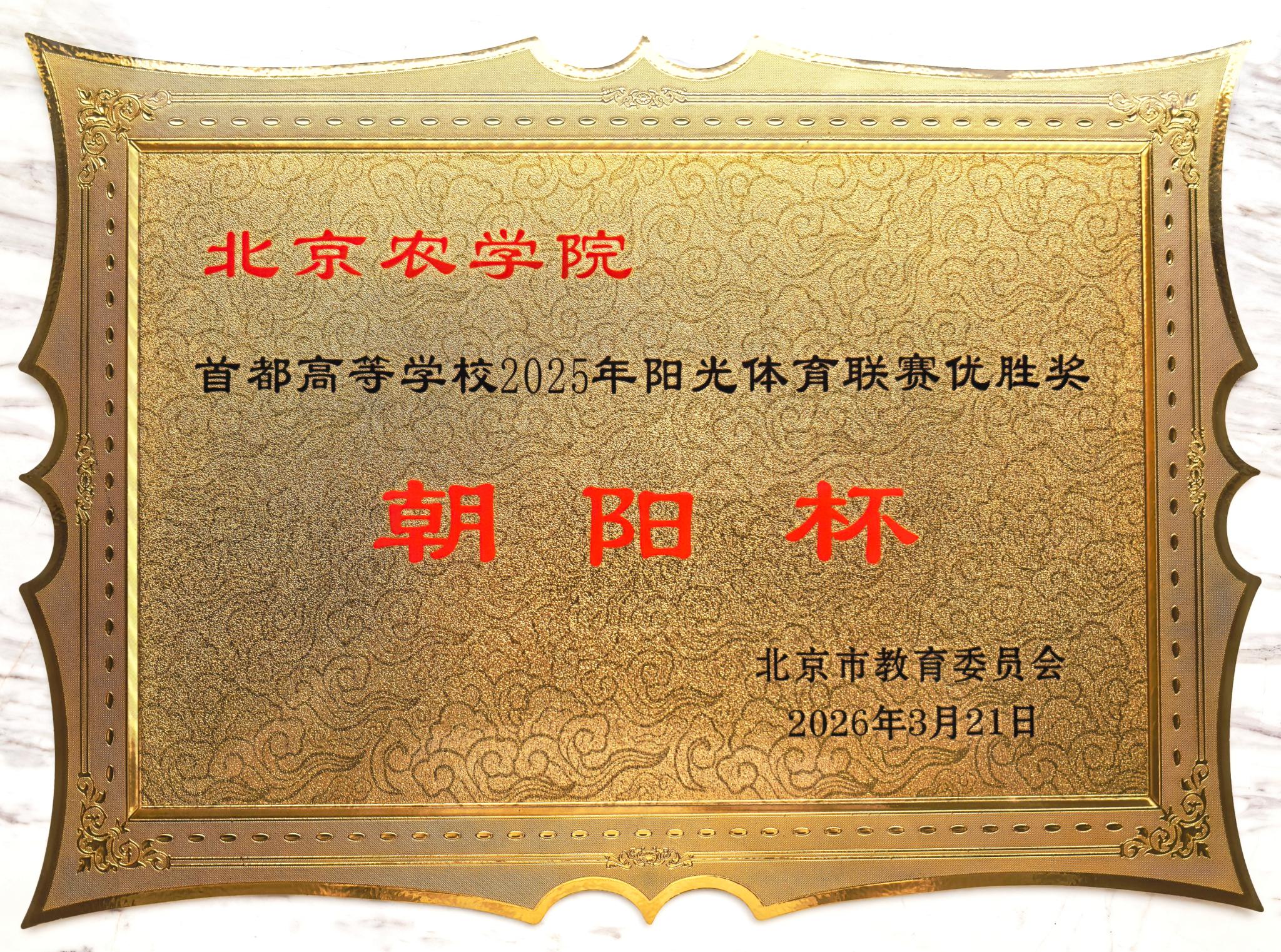 3月21日—22日,北京市大学生体育协会第七届二次理事(扩大)会议召开,会上对2025年度首都高等学校阳光体育联赛优胜学校进行表彰。我校凭借在群众性体育赛事、体育教学与科研等方面的优异表现,荣获首都高等学校2025年阳光体育联赛“朝阳杯”优胜奖。