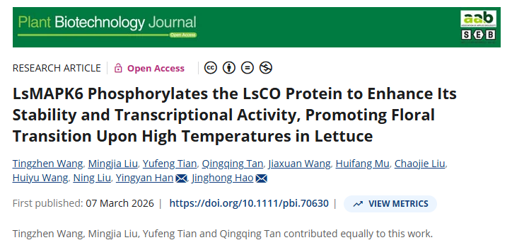 近日,北京农学院植物科学技术学院韩莹琰/郝敬虹教授团队在国际知名学术期刊Plant Biotechnology Journal在线发表了题为“LsMAPK6 Phosphorylates the LsCO Protein to Enhance Its Stability and Transcriptional Activity, Promoting Floral Transition Upon High Temperatures in Lettuce(LsMAPK6磷酸化LsCO提高其蛋白稳定性和转录活性促进叶用莴苣高温下成花转变)”的研究论文。该研究揭示了高温诱导生菜抽薹的核心信号模块及其分子机制,不仅深化了对植物整合环境温度信号与发育时序的理解,更为分子设计育种培育耐热、晚抽薹生菜品种提供了关键的理论基础与潜在靶标。