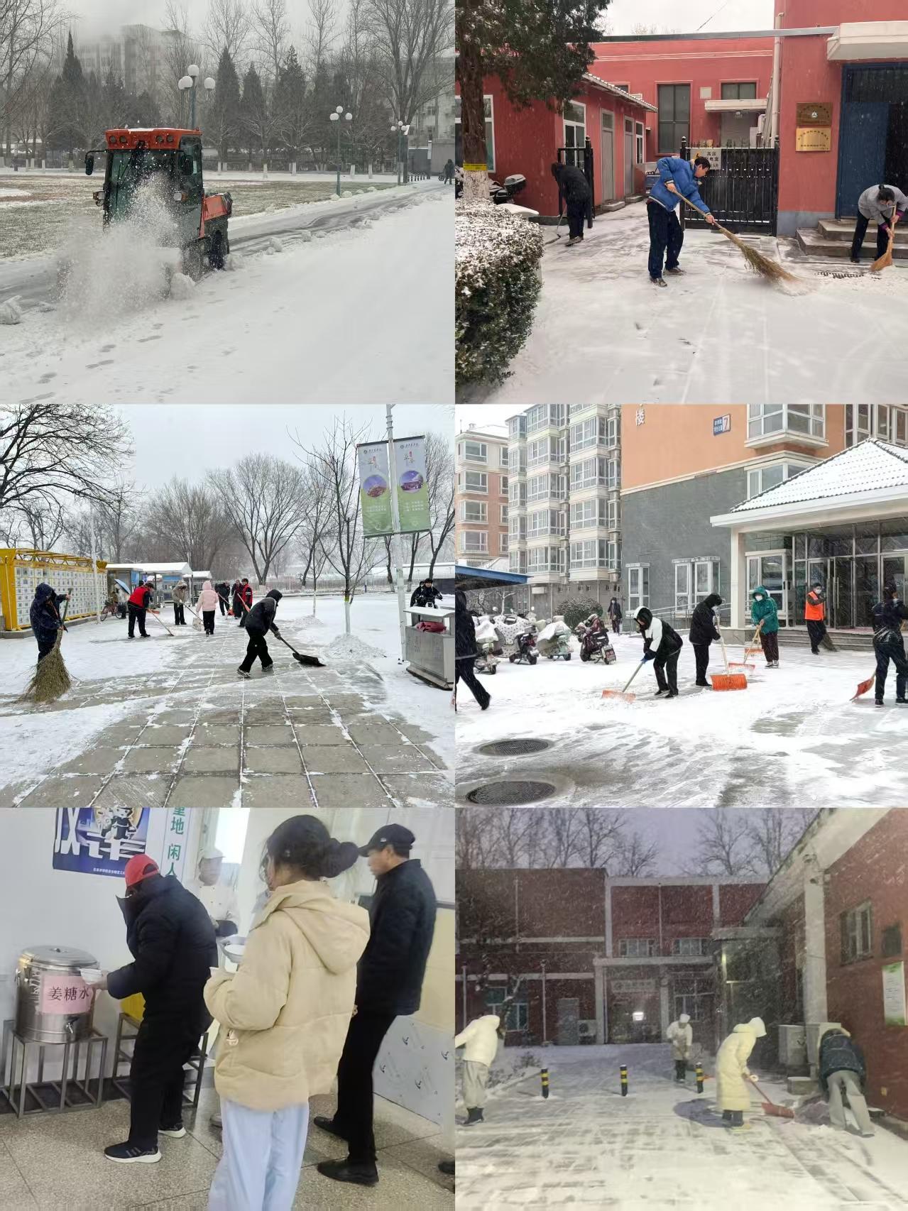 寒风中的坚守,是最暖的风景。机械组驾驶设备反复清扫主干道及停车场,人工组手持工具清理台阶、坡道等机械作业盲区,维修组同步排查校舍屋顶、树木枝干积雪隐患,保洁组在楼宇入口铺设防滑垫、摆放“小心地滑”警示标识。供暖组24小时值守,保障室内温度稳定,食堂团队提前到岗,备好暖暖的姜糖水,确保热餐热饮准时供应。冰雪覆盖的路面,汗水凝结成眉梢的冰霜,却挡不住大家“抢时间、保安全”的干劲。