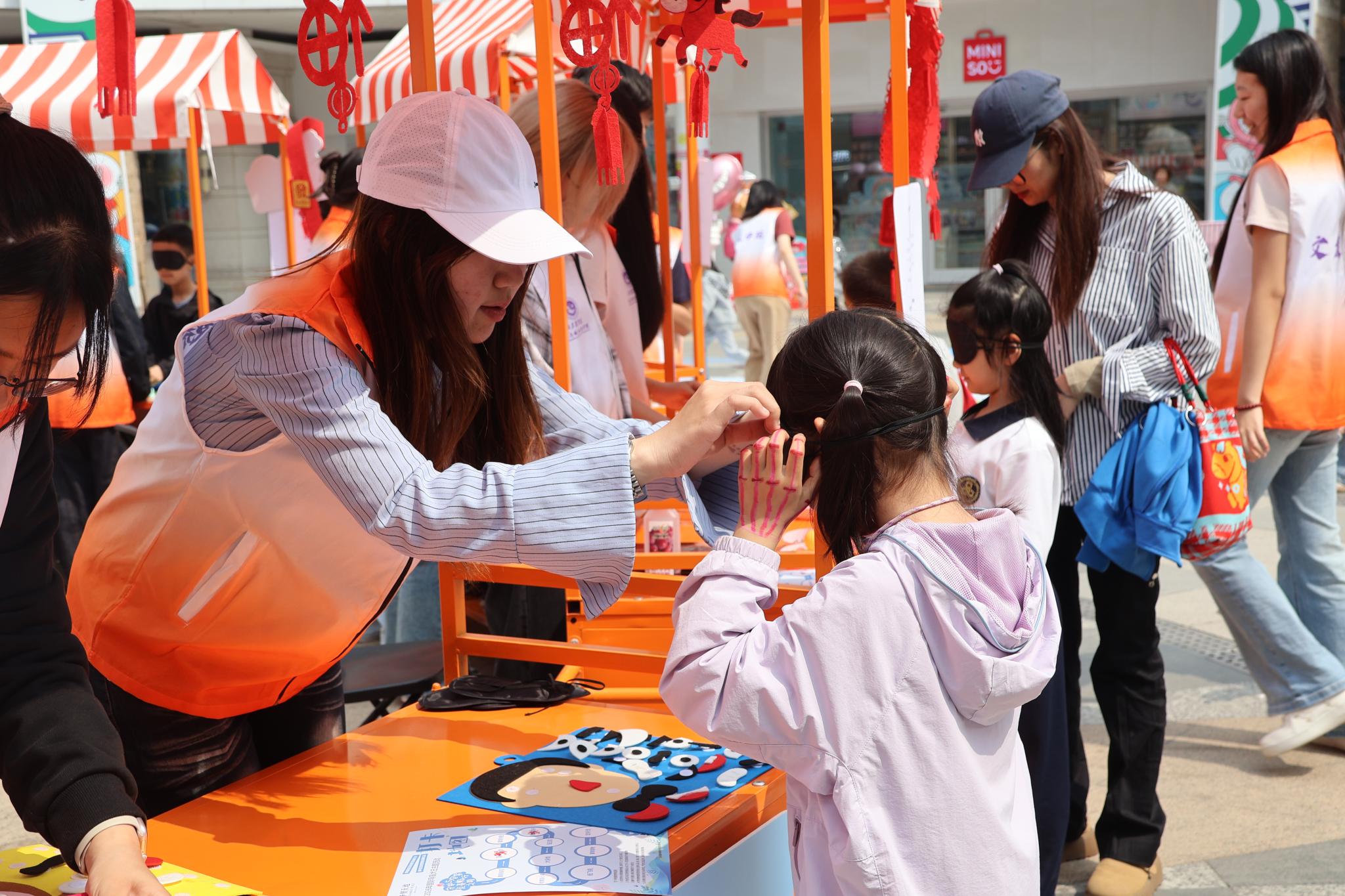 为更好地宣传推广无障碍环境建设理念,提升全社会对导盲犬的认知,文发学院60余名学生志愿者自主策划并组织了11个互动体验活动与2个宣传展示活动,同时为视障人士提供全程陪护服务。社会工作专业师生发挥专业优势,设计了蒙眼体验、互动科普、触觉感知等环节,引导公众沉浸式感受视障人士的日常生活,普及导盲犬相关知识;会展经济与管理专业师生则负责展示区工作,集中呈现导盲犬主题文创产品,以创意设计传递公益理念。此外,近20名志愿者为视障人士提供一对一陪护、路线引导等服务,保障其顺利参与各项活动。