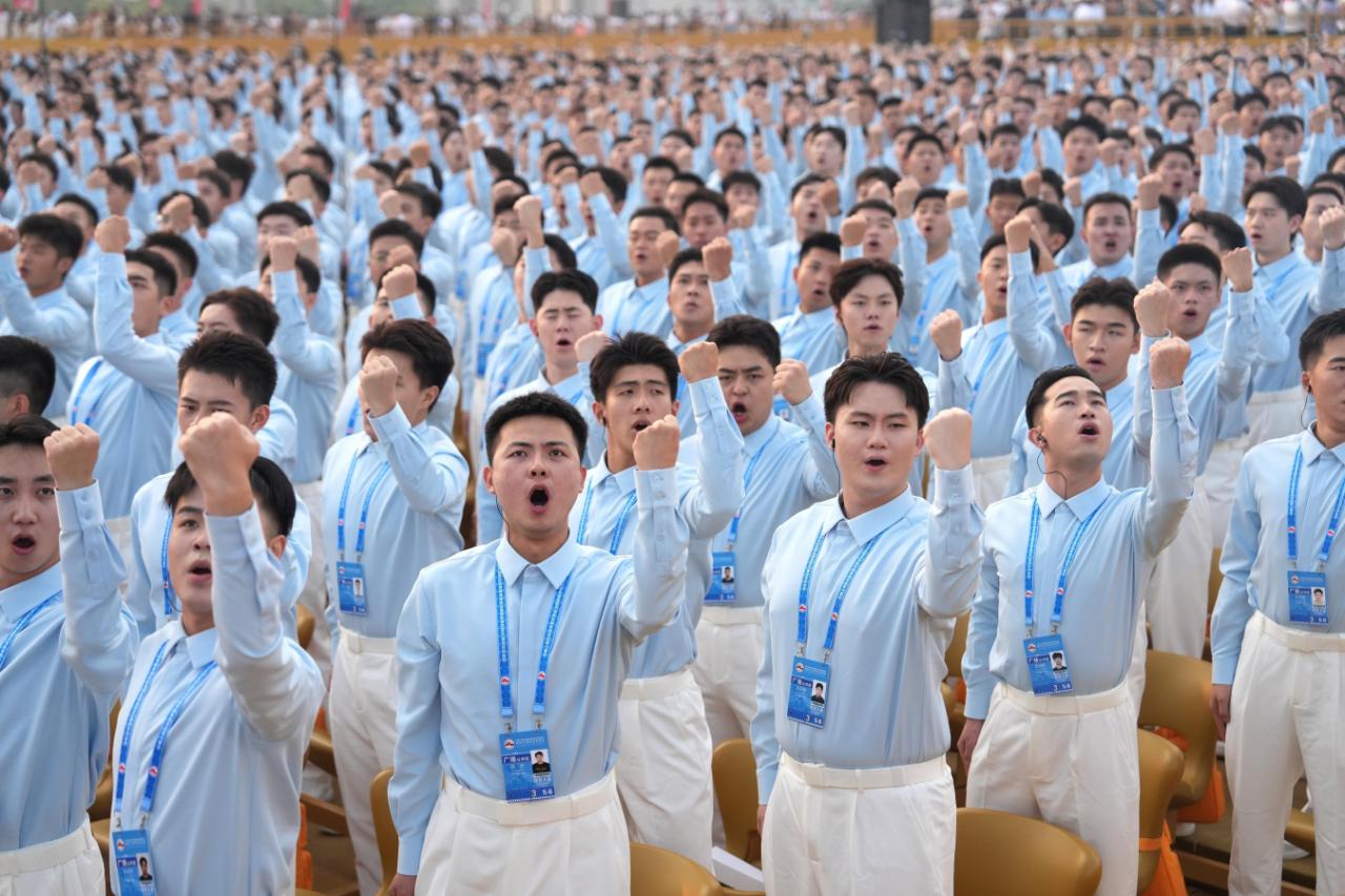 上午8时46分,《松花江上》的旋律响起,合唱团师生凝望人民英雄纪念碑,唱响这首曾经唤醒民族之魂的经典抗战歌曲,他们用《在太行山上》的歌声回顾八路军与太行军民英勇杀敌的场景……当和平鸽飞向天空,合唱团师生唱响《歌唱祖国》时,热泪伴着歌声从脸颊流下。