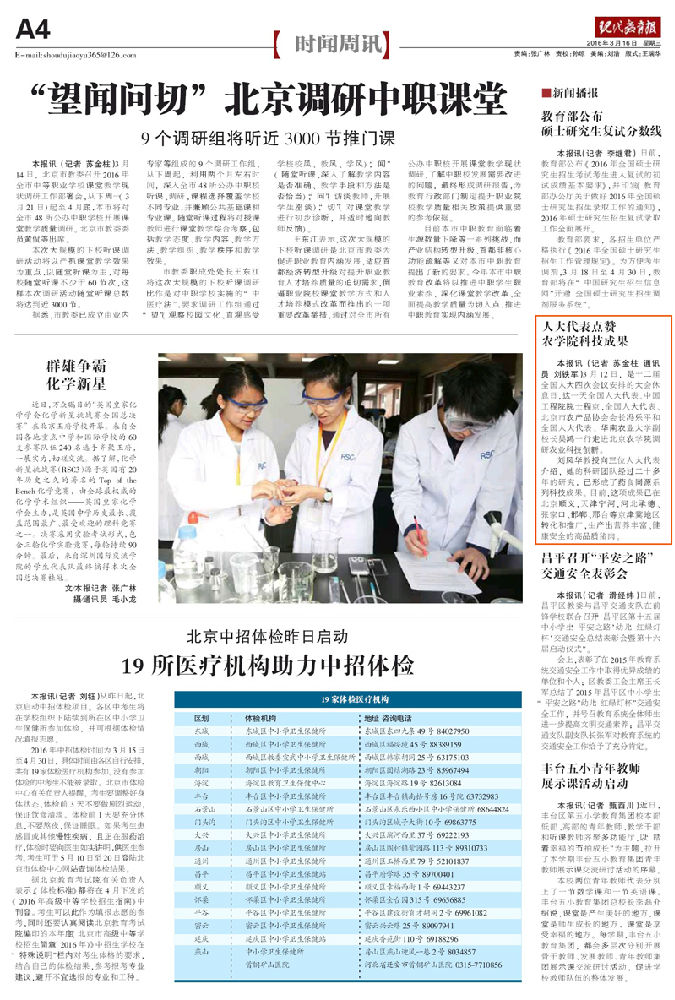 本报讯(记者 苏金柱 通讯员 刘铁军)3月12日,是十二届全国人大四次会议安排的大会休息日,这一天全国人大代表、中国工程院院士程京,全国人大代表、北京市农产品协会会长冯乐平和全国人大代表、华南农业大学副校长吴鸿一行走进北京农学院调研农业科技创新。